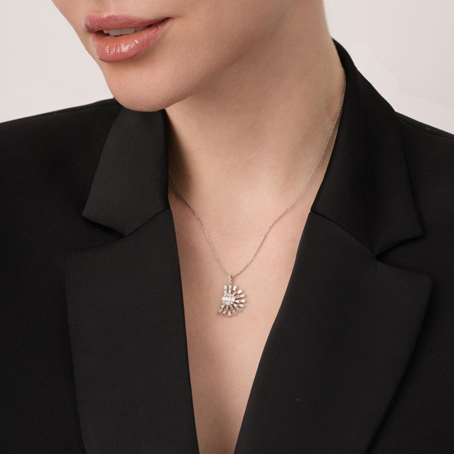 Zarif kesimli taşların dengeli yerleşimiyle öne çıkan bu kolye, modern stilin zamansız temsilcisidir. Gündüzden geceye taşınabilecek çok yönlü yapısıyla hem sade hem iddialı kombinlerin tamamlayıcısı olur.