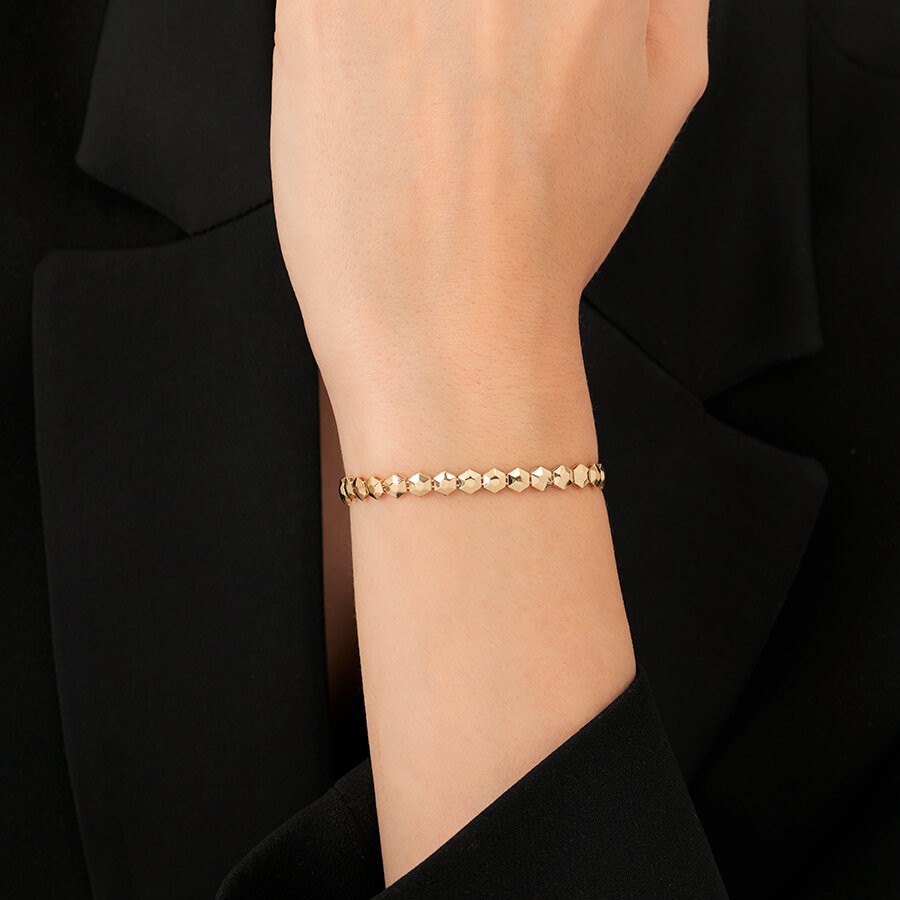 Altıgen şekliyle modern ve şık bir görünüm sunan bu altın bileklik, zarif tasarımıyla günlük kullanıma ve özel anlara kolayca uyum sağlar. Stilinizde minimal ve anlamlı bir dokunuş yaratır.