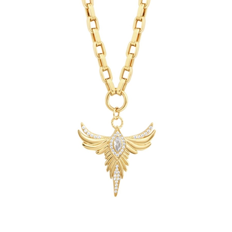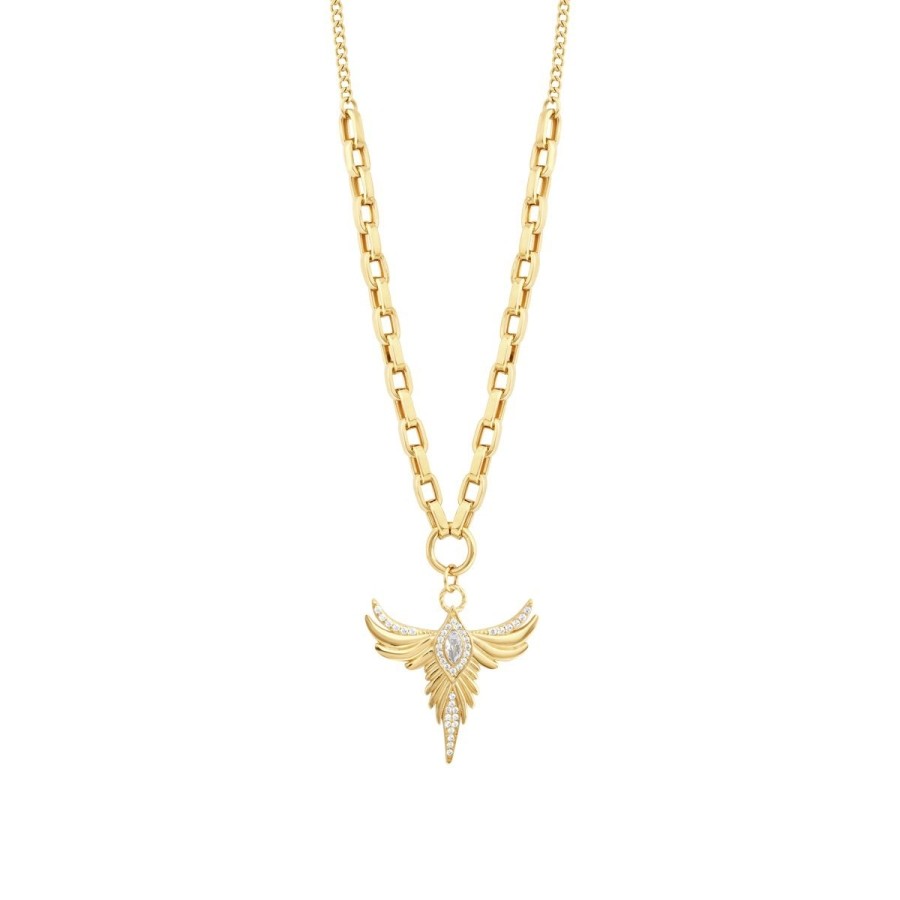 Altın Anka Kuşu Kolye, efsanevi zümrüdüanka kuşu motifini zarif detaylarla buluşturarak yeniden doğuşu ve gücü simgeliyor. Şık ve anlamlı tasarımıyla her stile uyum sağlayan bu özel aksesuar, zamansız bir ışıltıyla stilinize sofistike bir dokunuş katıyor.