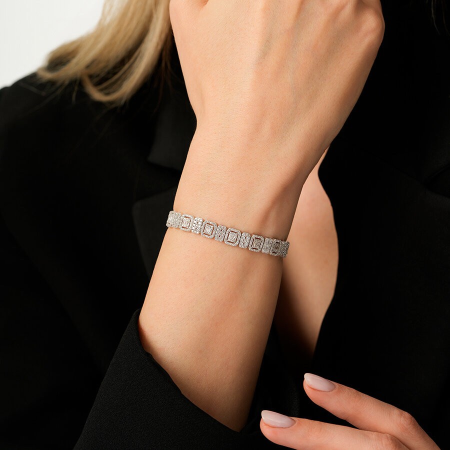 Zarif ama güçlü karakterlerden ilham alan bu tasarım, baget taşların net hatlarını ön plana çıkarıyor. Taşların berraklığı bileğinizde sofistike bir imza bırakıyor. Minimalist bir lüks anlayışını temsil eden bu bileklik, her anınızı özel bir davete dönüştürecek kadar etkileyici.