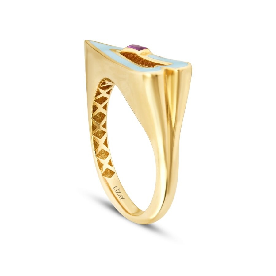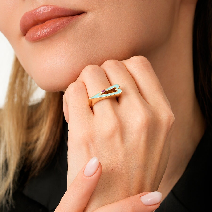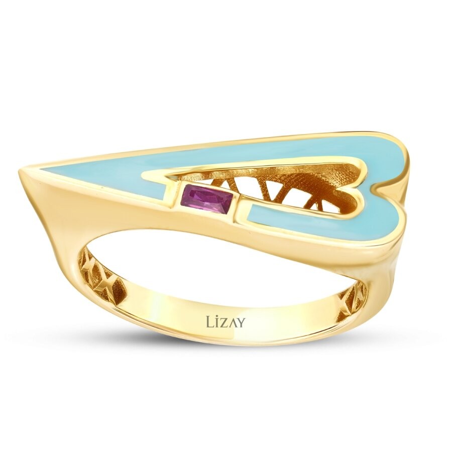 Kalp formunun zarif sıcaklığı, baget taşların asil duruşuyla duygusal bir denge yakalıyor. Altının yumuşak ışıltısı, tasarımı romantik olduğu kadar soylu bir çizgiye taşıyor. Söze ihtiyaç bırakmayan bu yüzük, sevginin en ince haliyle taşınmış bir hatıra gibi.