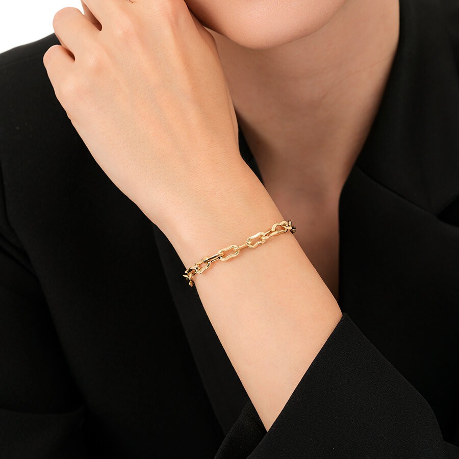 Burgu ve ataç detaylarının birleşimiyle tasarlanan bu altın bileklik, modern ve özgün bir şıklık sunar. Günlük kullanıma ve özel anlara uyum sağlayan zarif yapısıyla stilinize dikkat çekici bir dokunuş katar.