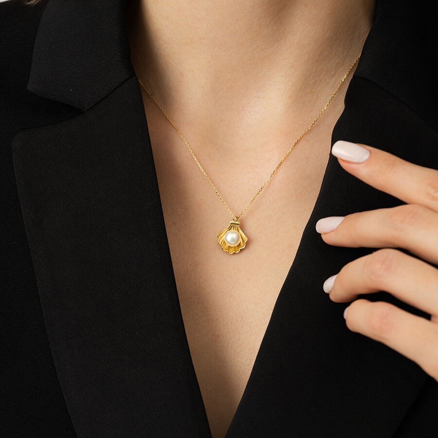 Altın Büyük İncili İstiridye Kolye, doğanın zarafetini stilinize taşır. İncinin saflığı ve istiridyenin koruyucu sembolizmi bir araya gelerek, hem şık hem duygusal bir dokunuş sunar.