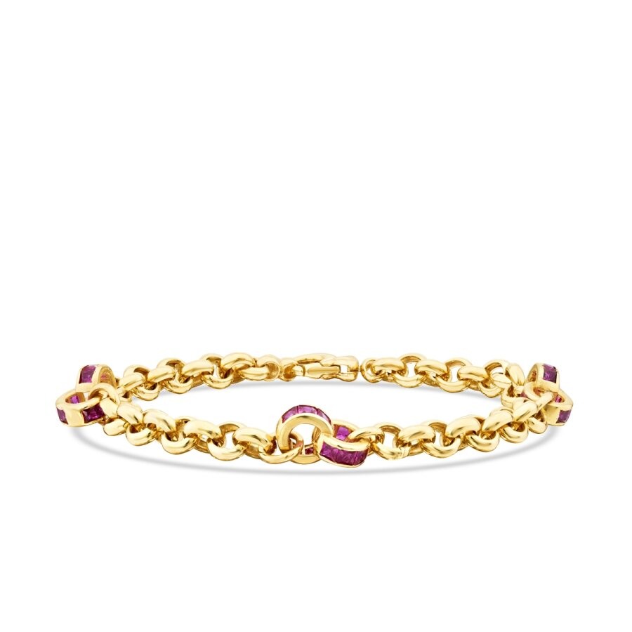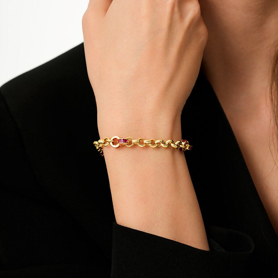 Cesur renklerin ve iddialı formların buluştuğu bu bileklik, stilinde fark yaratmak isteyen kadınlar için ikonik bir parça. Fuşyanın enerjisi ile kalın altın zincirin yarattığı güçlü kontrast, modern bir özgüvenin simgesi olarak öne çıkıyor. Hem spor hem de şık kombinlerin başrolü olmaya aday bu tasarım, enerjinizi mücevherinize yansıtıyor.