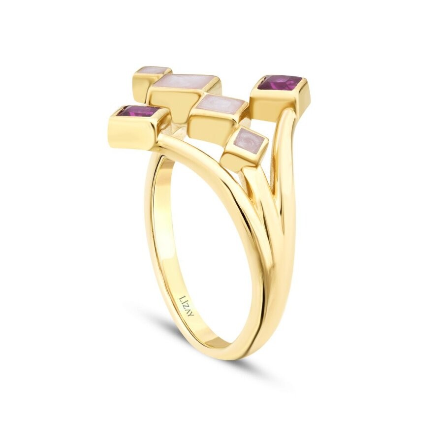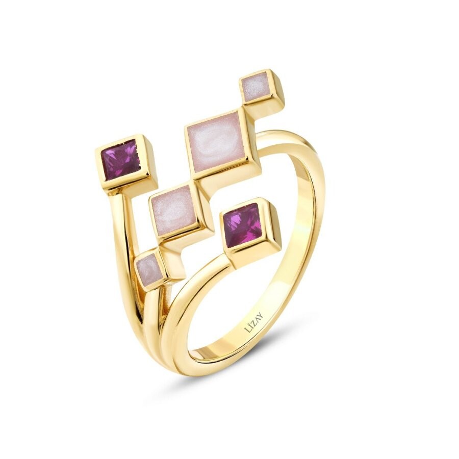 Altın Fuşya Taşlı Mineli Geometrik Trend Yüzük T9882