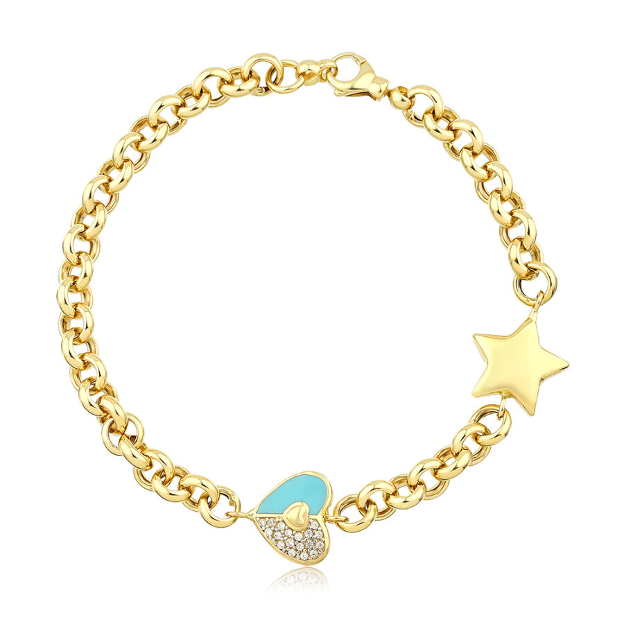 Kalp ve yıldız sembollerinin uyumu bu modelde hayat buluyor. Anlamlı figürleri zarif bir çizgide birleştirerek şıklıkla sunar.