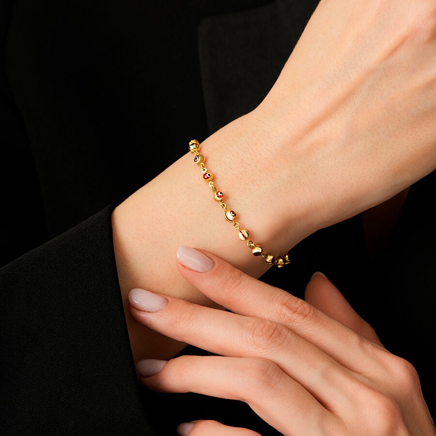 Binlerce yıllık bir tılsımın modern ve lüks bir yorumu olan bu tasarım, koruyucu enerjiyi altının asil ışıltısıyla birleştiriyor. Geleneksel mavi tonların altınla kurduğu bu eşsiz kontrast, bileğinizde hem huzurlu hem de iddialı bir görünüm yaratıyor. Sevdiklerinize sunabileceğiniz en anlamlı hediyelerden biri olan bu bileklik, zamansız bir bağlılığın simgesi olarak her anınıza eşlik edecek.