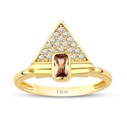 Bu altın renkli taşlı üçgen yüzük, şıklık ve zarafetin ahengini ve inceliklerini yansıtan bir parçadır.
