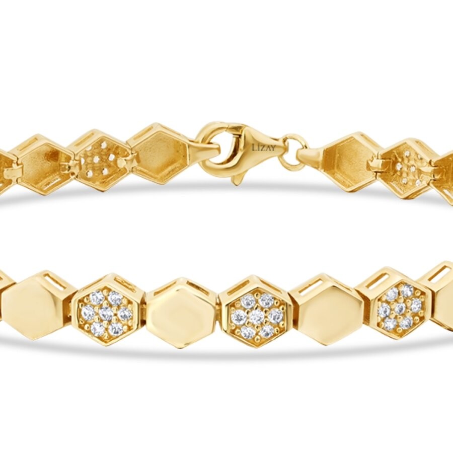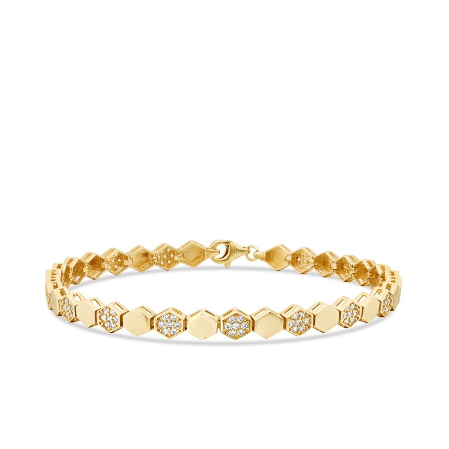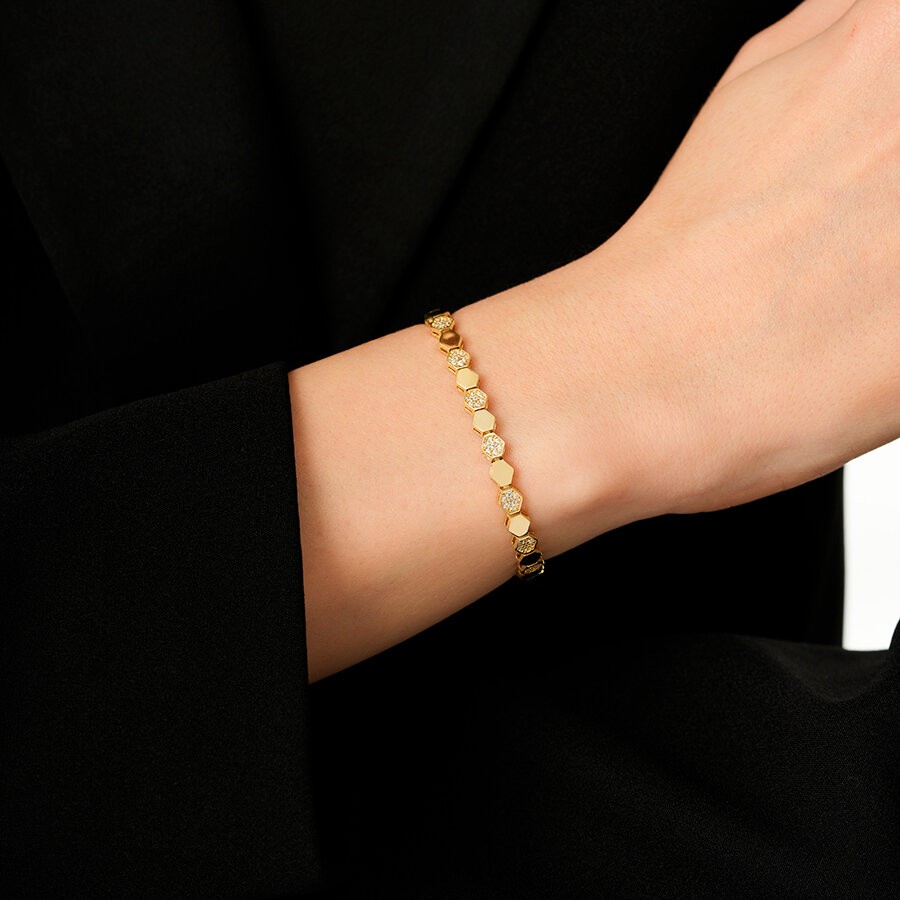 Doğanın en kusursuz mimarisi olan petek dokusu, pırlanta parıltılı taşlarla işlenerek bileğinize taşınıyor. Altının geometrik düzeni içindeki taşların yarattığı ışıltı, doğanın bereketini ve çalışkanlığını asil bir zarafetle temsil ediyor. Bu özgün tasarım, hem modern hem de hikayesi olan bir parça arayanlar için büyüleyici bir seçenek.