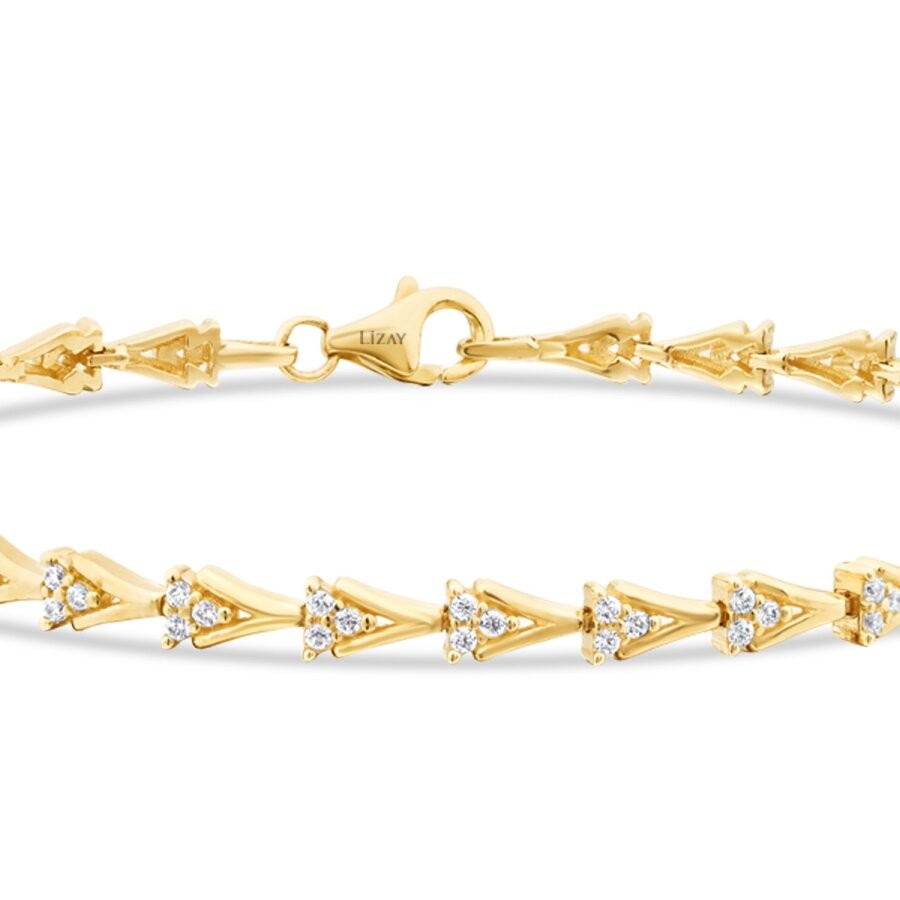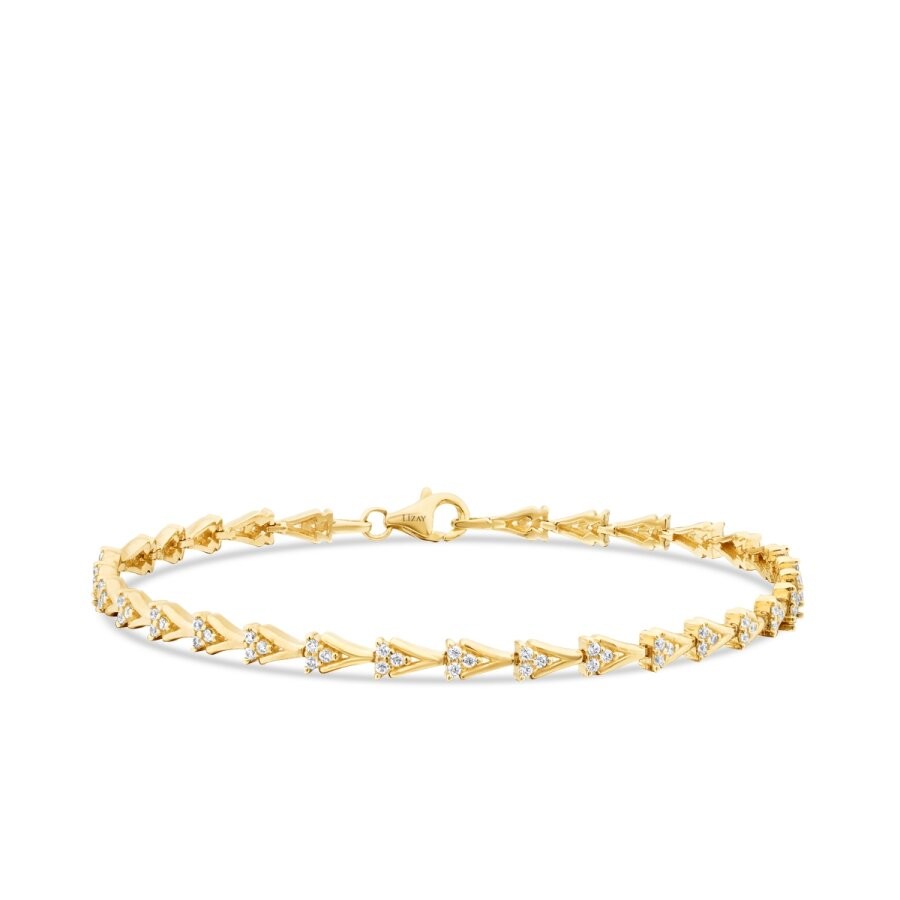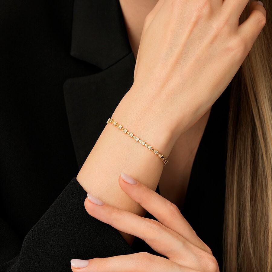 Keskin hatların ve asimetrik şıklığın birleştiği bu tasarım, "V" formunun modern estetiğini pırlanta ışıltılı taşlarla taçlandırıyor. Altının güçlü duruşu ve taşların yarattığı zarif hat, bileğinizde adeta bir heykel gibi duruyor. Modernist bir bakış açısıyla tasarlanan bu bileklik, sofistike detaylara önem verenler için ideal bir tercih.