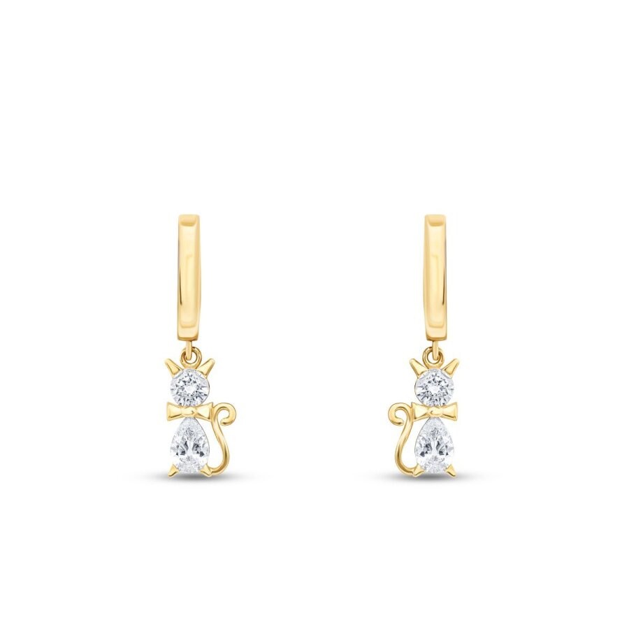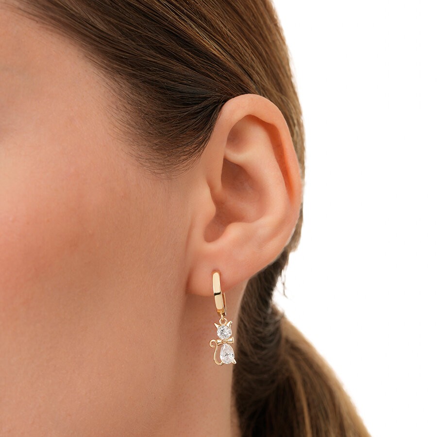 Taş detaylarıyla parlayan bu altın kedi küpe, sevimli ve zarif tasarımıyla dikkat çeker. Günlük kullanıma uygun, stilinize eğlenceli ve şık bir dokunuş katan özel bir aksesuardır.