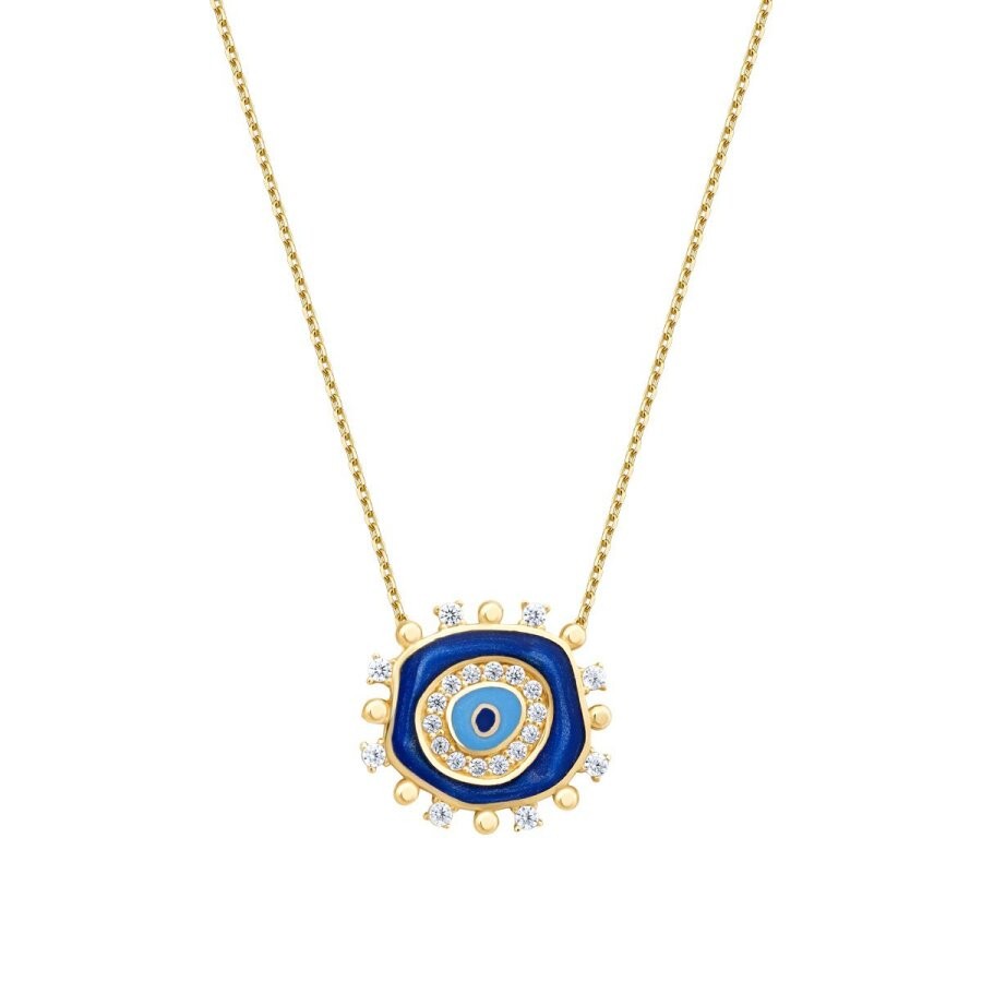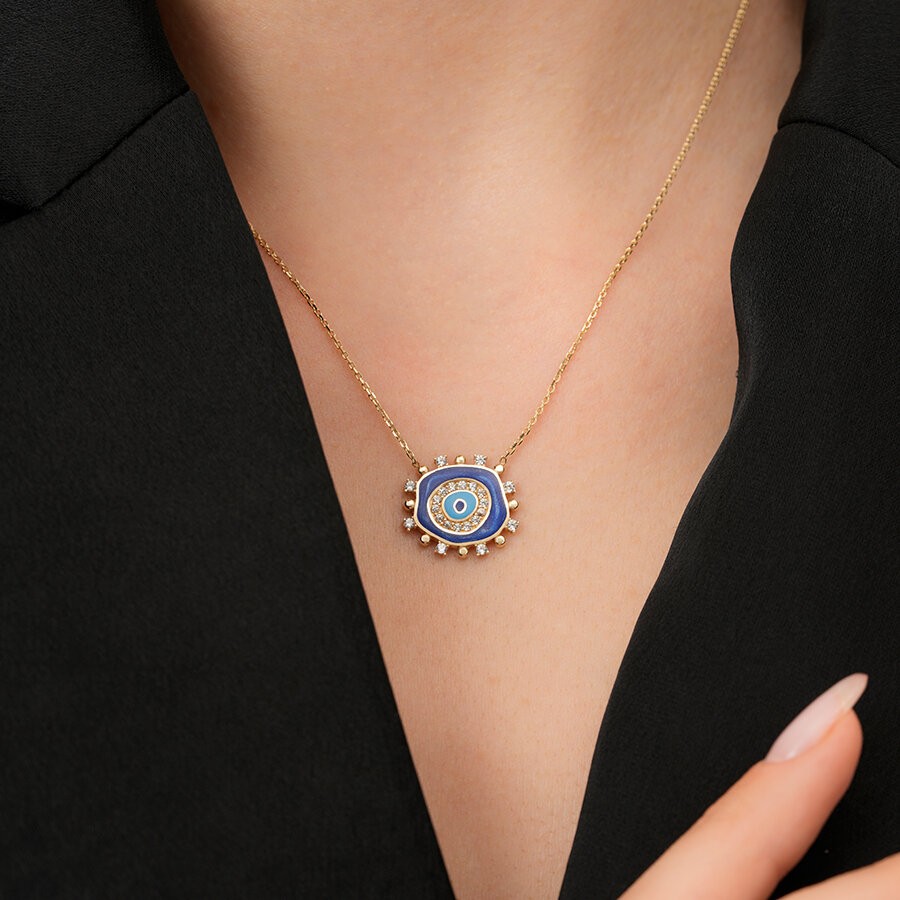 Mavi nazar figürüyle süslenen bu altın kolye, hem şıklığı hem de koruyucu anlamı bir arada sunar. Zarif tasarımı sayesinde günlük kullanıma ve özel günlere rahatlıkla uyum sağlar. Her stile enerji ve zarafet katan anlamlı bir aksesuardır.