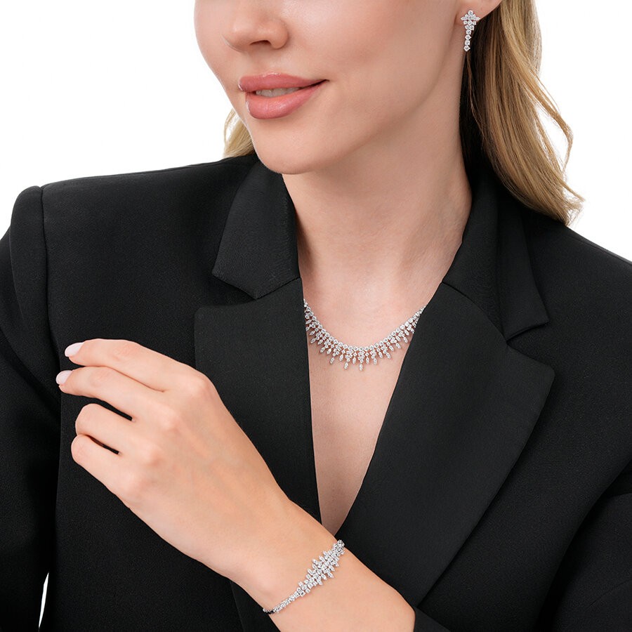 Modern çizgileriyle tasarlanan bu taşlı trend gerdanlık, göz kamaştırıcı ışıltısıyla dikkat çeker. Hem gündelik hem de özel günlerde sofistike bir tamamlayıcı olur.
