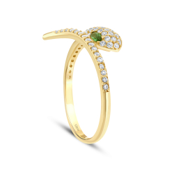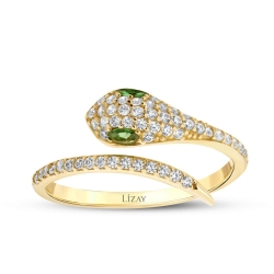 Altın Taşlı Yılan Yüzük, yılan formu ve ışıltılı taş detaylarıyla cesur ve sofistike bir stil sunar. Gücü ve dönüşümü simgeleyen bu dikkat çekici tasarım, stilinize iddialı bir dokunuş katmak için mükemmel bir seçimdir. Zamansız ve etkileyici bir aksesuar!