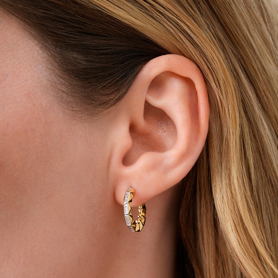 Üçgen formuyla tasarlanan sıra taşlı bu halka küpe, güçlü ve modern bir görünüm sergiler. Işıltısıyla dikkat çeker, tarzınıza karakter katan farklı bir seçenektir.