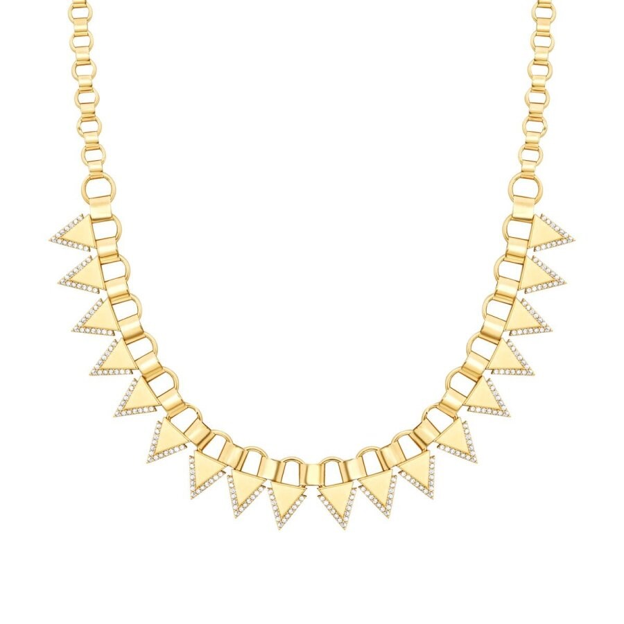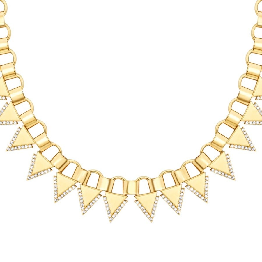 Üçgen taş detaylarıyla öne çıkan bu altın gerdanlık, modern ve zarif bir şıklık sunar. İnce tasarımı sayesinde günlük kullanıma ve özel anlara rahatlıkla uyum sağlar. Stilinize özgünlük ve ışıltı katmak isteyenler için ideal bir aksesuardır.