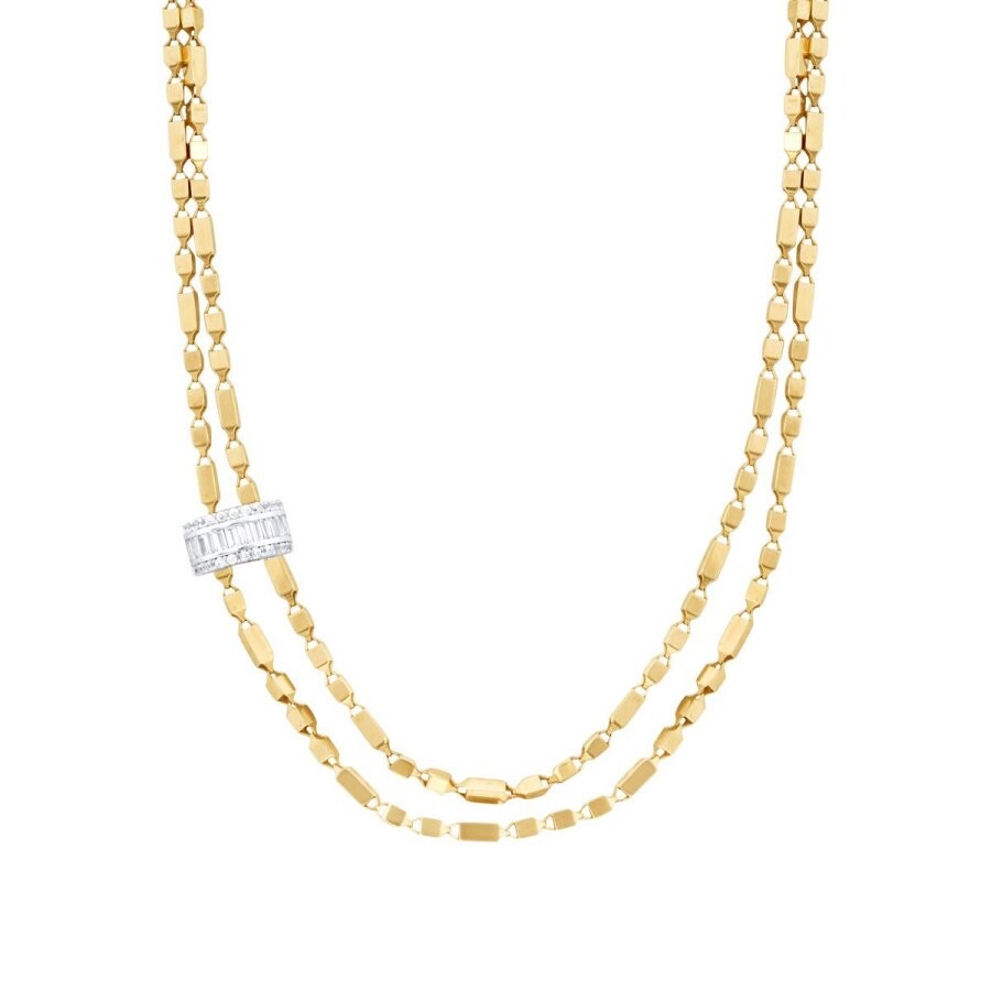 Baget taş detaylarıyla zariflik kazanan bu altın kolye, ince zincir detayıyla modern ve şık bir görünüm sunar. Günlük kullanıma ve özel anlara kolayca uyum sağlayan, her stile zarafet katan özel bir aksesuardır.