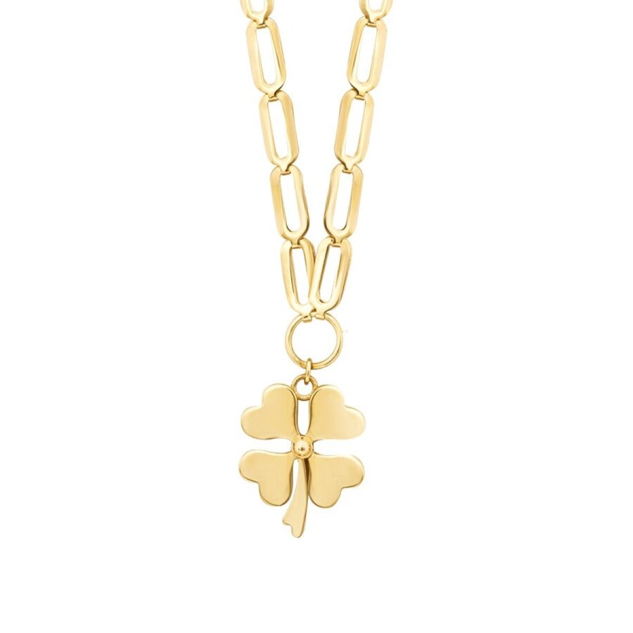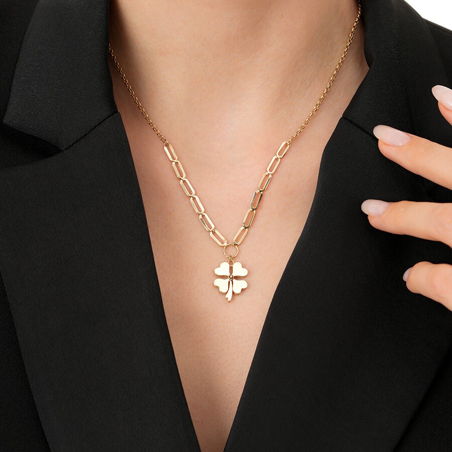 Yonca figürüyle tasarlanmış bu altın kolye, şans ve zarafeti bir arada sunar. İnce zincir detayıyla modern ve zarif bir görünüm yakalar. Günlük kullanıma ve özel anlara kolaylıkla uyum sağlayan, her stile anlam katan özel bir aksesuardır.